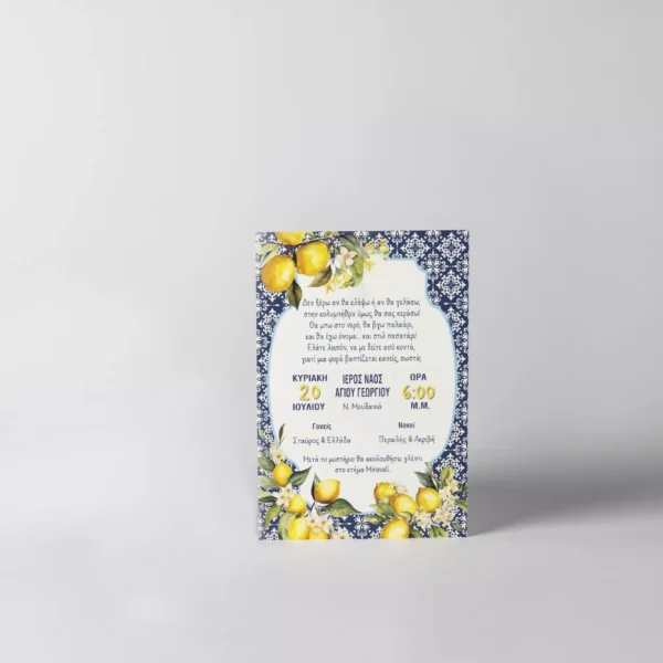 Προσκλητήριο βάπτισης με γεωμετρικά σχήματα και λεμόνια