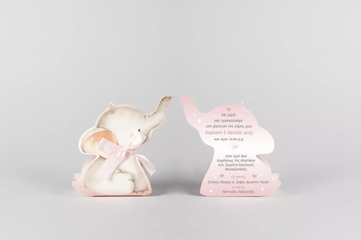Προσκλητήριο βάπτισης και μπομπονιέρα με θέμα το ροζ ελεφαντάκι