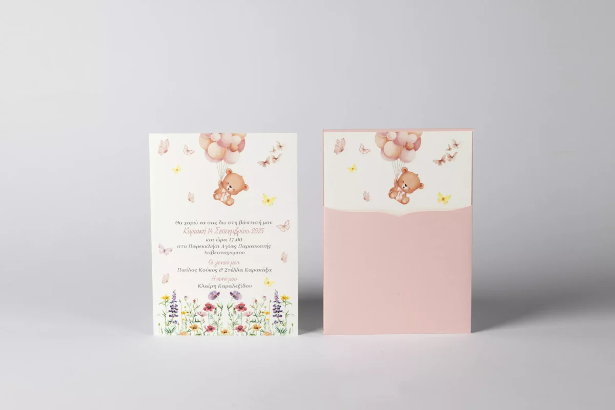 Προσκλητήριο βάπτισης με θέμα το ροζ αρκούδι