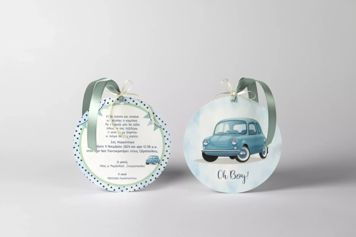 Προσκλητήριο βάπτισης με μπλε αυτοκινητάκι